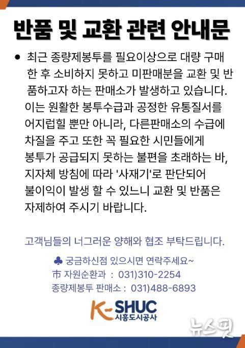 시흥도시공사 관계자는 “반품·환불 문의 증가는 공급 불안 우려가 해소 과정에서 나타나는 일시적 현상”이라며 “유통 질서 회복을 위해 재고 조정 및 관리 절차를 단계적으로 추진하고 있다”라고 설명했다.