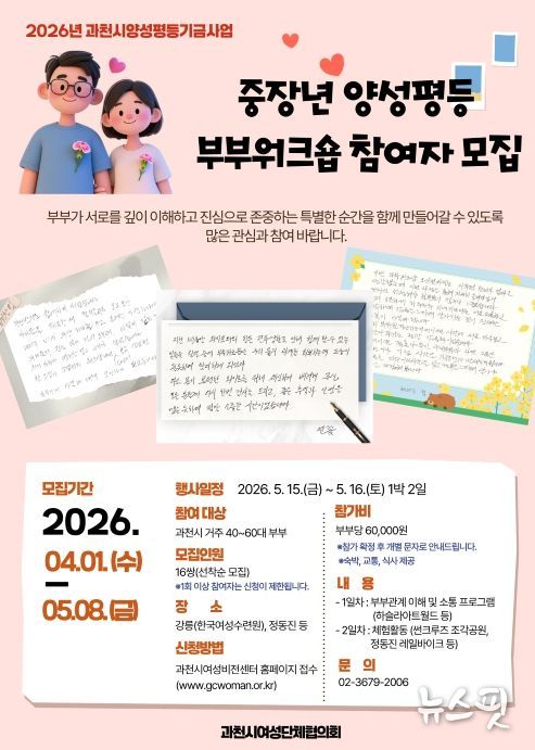 이번 사업은 부부간 소통과 이해를 높이고 서로를 존중하는 관계 형성을 지원하기 위한 것이다. 참여 신청은 과천시여성비전센터 누리집을 통해 진행 중이며, 모집 대상은 과천시에 거주하는 40~60대 부부 16쌍이다. 참가비는 부부당 6만 원이며, 기존 참여자는 재참여가 제한된다.