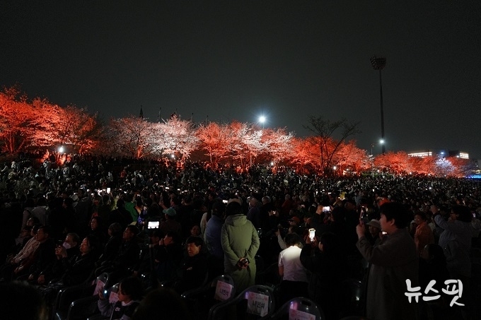 현장에서는 가수 황민호의 축하 공연을 비롯한 다양한 무대가 이어지며 봄밤의 분위기를 한층 끌어올렸다. 시민들은 벚꽃이 만개한 산책로를 따라 걸으며 빛과 음악이 어우러진 풍경을 즐기는 등 여유로운 시간을 보냈다.