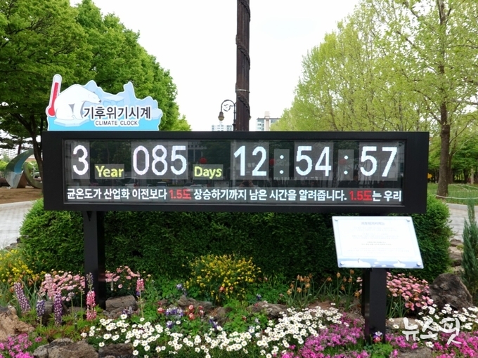 (뉴스핏 = 김수진 기자) 지난 3일 안양시 평촌중앙공원에 ‘경기도 최초’로 기후위기시계가 설치되어 눈길을 끌고 있다.