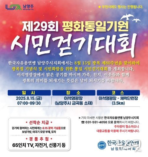 (뉴스핏 = 김수진 기자) 남양주시는 오는 15일 한국자유총연맹 남양주시지회 주관으로 ‘제29회 평화통일기원 시민걷기대회’가 금곡동 이석영광장에서 개최된다고 밝혔다.