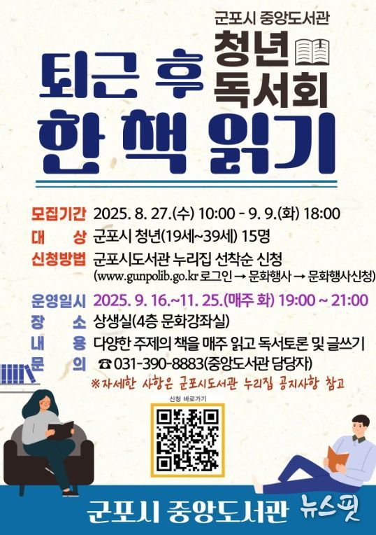(뉴스핏 = 김수진 기자) 군포시 중앙도서관은 지역 청년들의 인문적 소양 함양과 독서문화 확산을 위해 하반기 청년독서회 ‘퇴근 후 한 책 읽기’를 오는 9월 16일부터 11월 25일까지 운영한다.