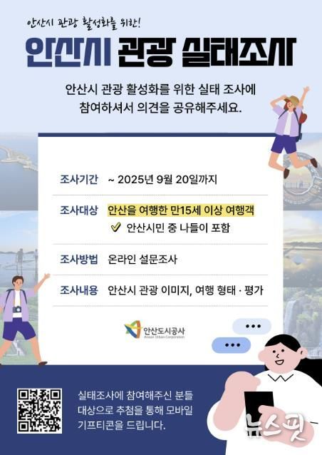 이진욱 안산도시공사 관광레저부장은 “정확한 실태조사를 바탕으로 안산관광의 매력을 보다 체계적으로 진단하고, 지역 특화형 관광 전략 수립에 적극 활용하겠다”며 “시민과 방문객의 생생한 의견을 정책에 반영해 실효성 높은 결과를 도출하겠다”고 밝혔다.