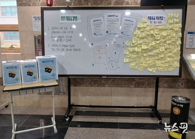 ‘학교와 함께하는 자원순환의 날’은 학생들이 가정에서 모은 폐건전지와 종이팩을 학교로 가져오면, 무게를 측정해 화장지로 교환해주는 사업이다.
