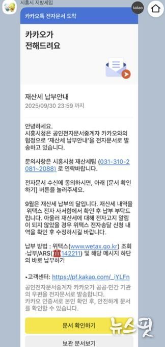 (뉴스핏 = 김수진 기자) 시흥시는 시민 편의 증진과 행정 효율성 강화를 위해 카카오톡을 활용한 ‘시세 안내 모바일 전자고지 서비스’를 본격 도입하고, 지난 16일부터 시행에 들어갔다.
