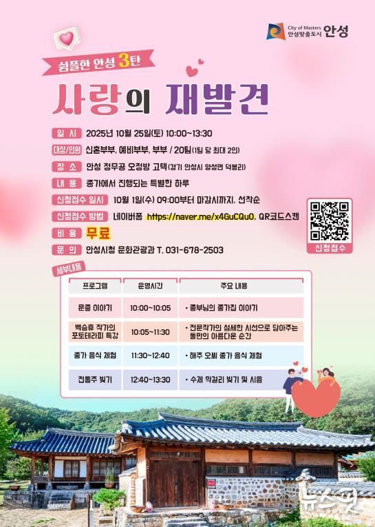 전통과 현대가 어우러지는 이번 행사는 안성의 문화유산 힐링프로그램 '쉼플한 안성' 시리즈의 마지막을 장식하는 특별한 시간이다. 그동안 이어온 쉼과 여유의 여정을 마무리하며, 부부가 함께 서로의 마음을 다시 확인하고 오래도록 간직할 소중한 추억을 만들어가는 순간이 될 것으로 기대된다.