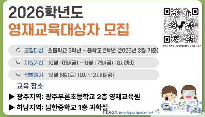 (뉴스핏 = 김수진 기자) 경기도광주하남교육지원청이 2026학년도 부설영재교육원 영재교육대상자 선발을 시작한다. 지원서 접수는 10월 10일부터 진행되며, 대상은 접수일 기준 광주·하남 지역의 초등학교 2학년부터 중학교 1학년까지다.