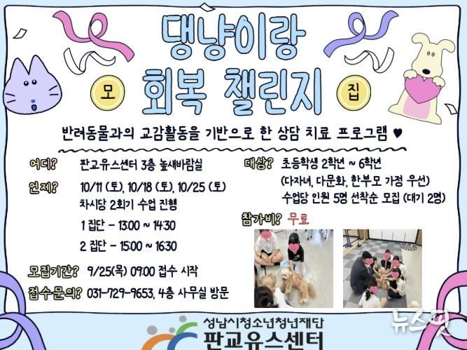 (뉴스핏 = 김호 기자) 성남시청소년청년재단 판교유스센터에서 초등학생과 가족을 대상으로 반려동물 교감 프로그램 ‘댕냥이랑 회복챌린지’를 운영한다고 밝혔다. 프로그램은 2025년 10월 11일, 18일, 25일 3회에 걸쳐 진행되며, 정서적 위기를 겪는 청소년을 포함한 취약계층 아동의 정서 회복을 지원하기 위해 마련됐다.