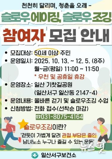 (뉴스핏 = 김수진 기자) 고양특례시 일산서구보건소는 10월 13일부터 12월 5일까지(8주간) 진행되는 ‘슬로우에이징·슬로우조깅’ 프로그램 참여자를 모집한다고 밝혔다.