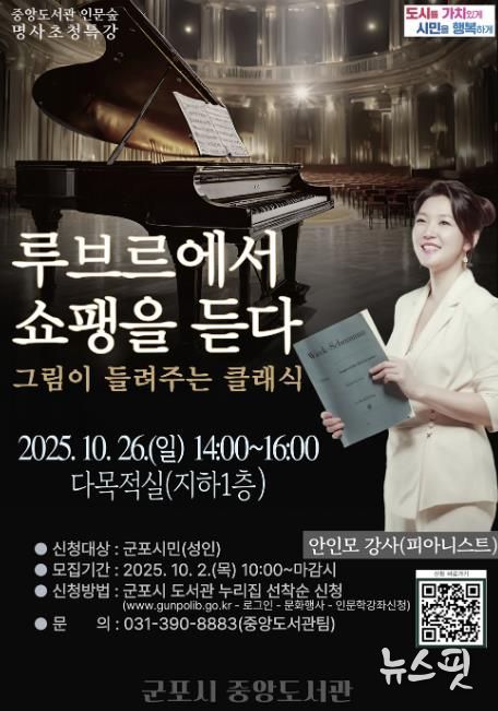군포시민 100명을 대상으로 하는 이번 특강 참여 신청은 10월 2일 오전 10시부터 군포시도서관 누리집을 통해 선착순으로 접수할 수 있다.