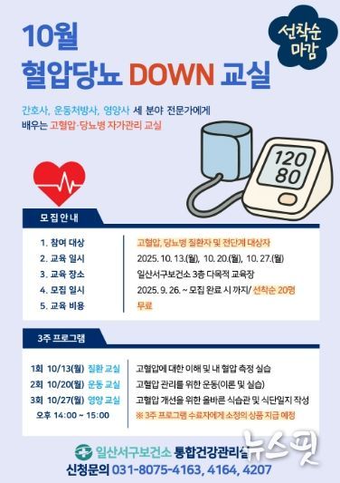 (뉴스핏 = 김수진 기자) 고양특례시 일산서구보건소는 10월‘혈압당뇨 DOWN 교실’에 참여할 대상자를 모집한다.