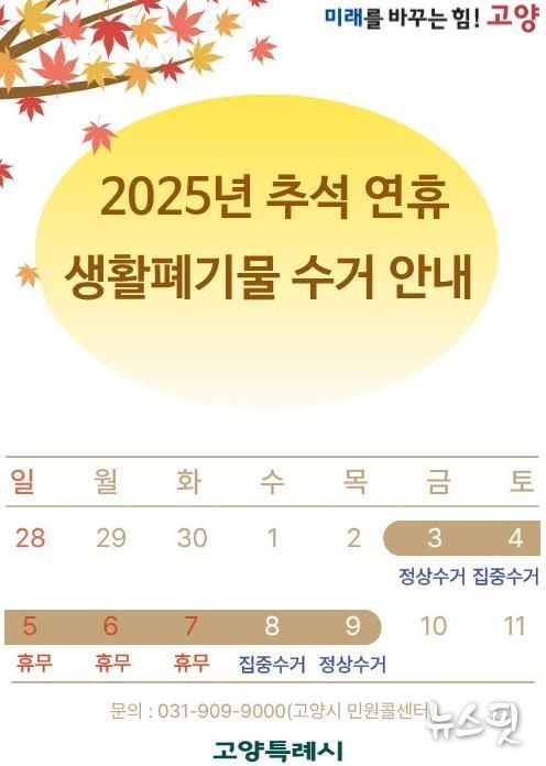 (뉴스핏 = 김호 기자) 고양특례시는 다가오는 추석 연휴를 맞아 시민들이 쾌적하고 깨끗한 환경 속에서 명절을 보낼 수 있도록 ‘추석 연휴 생활쓰레기 관리대책’을 수립해 본격 추진한다.