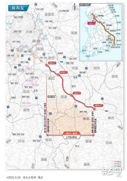 국토교통부에 따르면 안성과 용인-음성-충주를 연결하는 민자고속도로는 손익 공유형(BTO-a) 방식으로 추진되며, 총연장 약 55km, 왕복 4차로, 설계속도는 시속 110km