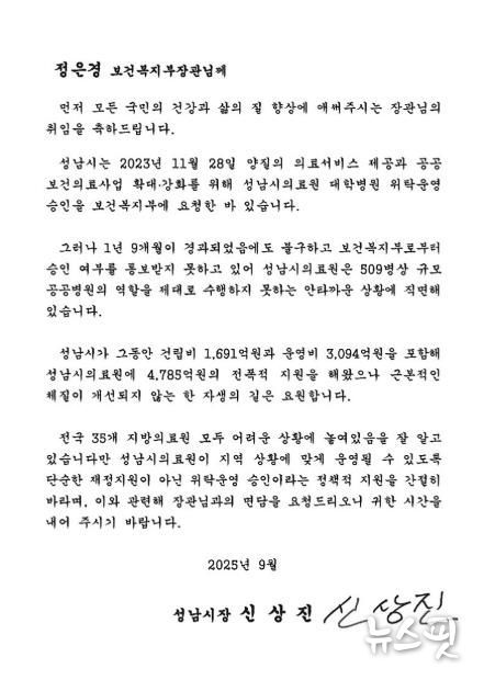 이어 “성남시의료원이 지역 상황에 맞게 운영될 수 있도록 단순한 재정지원이 아닌 위탁운영 승인이라는 정책적 지원이 반드시 필요하다”며 “이와 관련해 장관님과의 면담을 요청드린다”고 밝혔다.