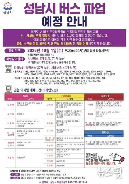(뉴스핏 = 김호 기자) 성남시는 경기도버스노동조합협의회가 임금 인상 등을 요구하며 10월 1일 총파업을 예고함에 따라 시민 불편을 최소화하기 위해 비상수송대책본부를 가동하고 비상수송 대책을 시행한다고 밝혔다.