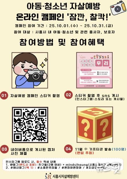 (뉴스핏 = 김수진 기자) 시흥시자살예방센터는 오는 10월 1일부터 31일까지 한 달간 아동ㆍ청소년을 대상으로 생명존중 인식 확산 캠페인을 운영한다고 30일 밝혔다.