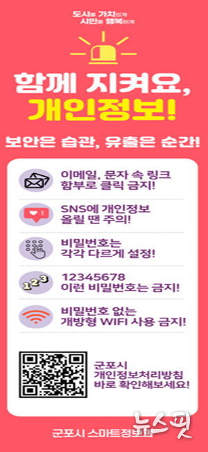 (뉴스핏 = 김수진 기자) 군포시는 30일 ‘개인정보 보호의 날’을 맞아 시민들의 개인정보 보호 인식을 높이고 생활 속 보호 문화를 확산하기 위해 ‘2025년 개인정보 보호의 날 기념 캠페인’을 10월 2일까지 추진한다.