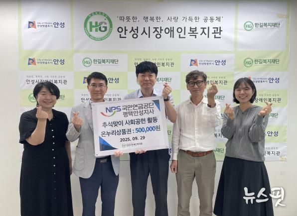 (뉴스핏 = 김수진 기자) 사회복지법인 한길복지재단에서 수탁하고 있는 안성시장애인복지관은 지난 29일 국민연금공단 평택안성지사로부터 사회공헌활동으로 50만원 상당의 온누리 상품권을 후원받았다고 밝혔다.