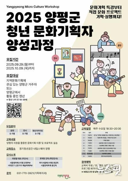 (뉴스핏 = 김호 기자) 양평군은 청년들의 문화·예술 기획 역량 강화를 통해 지역사회 문화 활성화와 청년 일자리 창출을 지원하고자 ‘2025년 양평군 청년 문화기획자 양성과정’을 10월부터 12월까지 운영한다고 밝혔다.