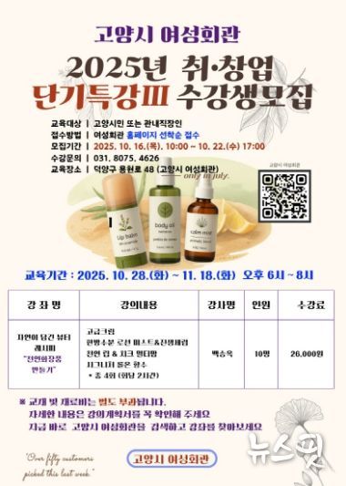 (뉴스핏 = 김호 기자) 고양특례시 여성회관에서는 친환경과 건강을 중시하는 최신 트렌드를 반영한‘취창업 단기특강Ⅲ’수강생을 모집한다.