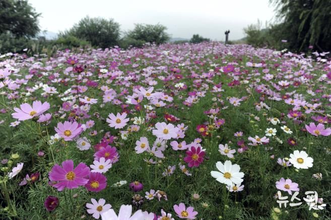(뉴스핏 = 김호 기자) 성남시 탄천 태평 습지생태원(수정구 태평동) 일대에 백만 송이의 코스모스 길이 펼쳐져 가을 정취를 전하고 있다.