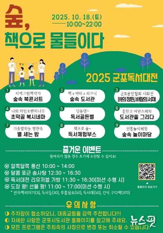 하은호 군포시장은 “2025 군포독서대전은 단순한 책 축제가 아니라 시민이 책과 자연 속에서 교감하며 휴식과 영감을 얻는 문화의 장이 될 것”이라며 “책 읽는 도시 군포의 정체성을 강화하고 시민의 문화적 자긍심을 높이는 대표 축제로 발전시켜 나가겠다”고 밝혔다.