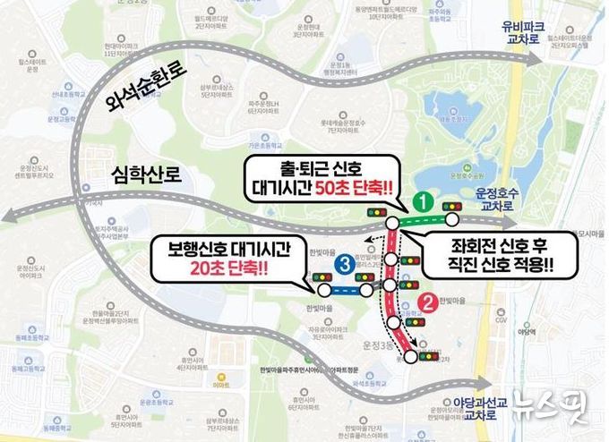 (뉴스핏 = 김호 기자) 파주시는 출퇴근 시간대에 신호주기가 길어 불편했던 운정 한빛마을 5단지 및 2·5단지 소도로 일대 구간의 신호체계를 우선적으로 개선했다고 밝혔다.