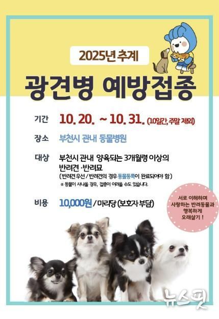 (뉴스핏 = 김호 기자) 부천시는 10월 20일부터 31일까지 토요일과 일요일을 제외한 평일에 관내 동물병원 71곳에서 ‘추계 광견병 예방접종’을 실시한다.