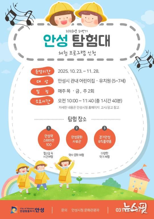 (뉴스핏 = 김수진 기자) 안성시는 상반기에 시범 운영해 큰 호응을 얻은 유아 대상 체험형 프로그램 ‘안성 탐험대: 역사 속으로, 음악 속으로!’를 하반기에도 운영하며, 지역 문화시설 활성화에 나선다.