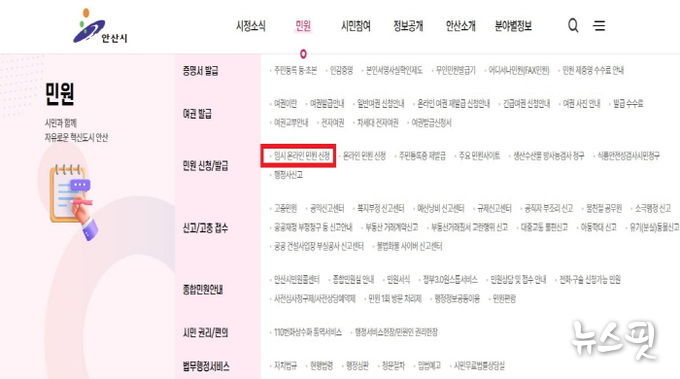 (뉴스핏 = 김호 기자) 안산시는 지난 13일부터 ‘국민신문고’ 시스템 장애에 대응해 안산시청 누리집에 ‘임시 온라인 민원 신청’ 창구를 설치하고 운영을 시작했다고 14일 밝혔다.