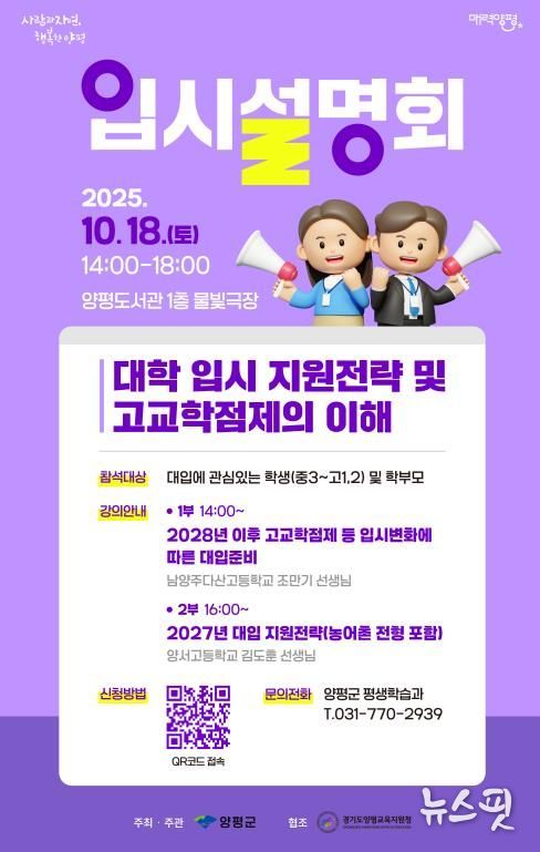 (뉴스핏 = 김호 기자) 양평군은 오는 10월 18일 오후 2시, 양평도서관 물빛극장에서 관내 학생과 학부모를 대상으로 ‘2025년 양평군 대학 입시설명회’를 개최한다고 밝혔다. 이번 설명회는 대학 입시에 관심 있는 학생과 학부모에게 다양한 입시 정보를 제공하기 위해 마련됐다.