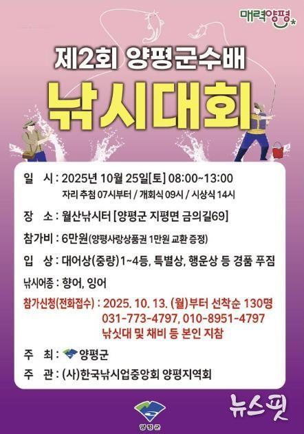 (뉴스핏 = 김수진 기자) 양평군은 오는 25일 관내 월산낚시터에서 ‘제2회 양평군수배 낚시 대회’를 개최한다고 14일 밝혔다.