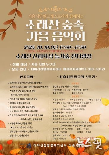 (뉴스핏 = 김수진 기자) 시흥시 대야ㆍ신천행정복지센터는 오는 10월 18일 소래산 삼림욕장 놀자숲 잔디광장에서 대야ㆍ신천동 지역 주민을 위한 ‘소래산 숲속 가을 음악회’를 개최한다.