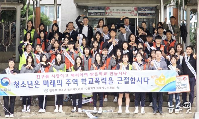 (뉴스핏 = 김호 기자) 수원시 영통구는 14일 동수원중학교 정문에서 법무부 청소년범죄예방위원 수원지역 영통지구위원회(이하 ‘범방위’, 회장 이윤희)와 동수원중학교 재학생, 교직원, 학부모회 등 50여명이 참여하여 ‘등굣길 청소년 선도 캠페인’을 실시했다.