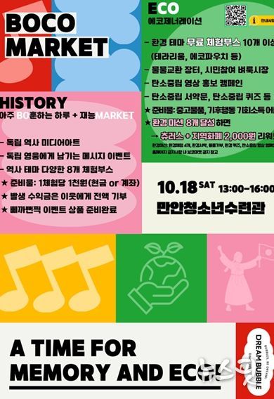 (뉴스핏 = 김수진 기자) 안양시청소년재단 소속 만안청소년수련관은 오는 18일 청소년과 시민이 함께하는 ‘환경과 역사를 잇다 - BOCO MARKET & E-G 페스티벌’을 개최한다고 15일 밝혔다.