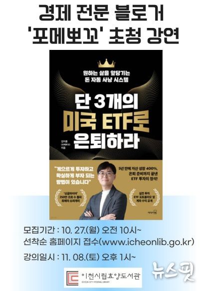 (뉴스핏 = 김수진 기자) 이천시 효양도서관은 시민들의 경제적 이해력 향상과 현명한 자산 관리 능력 제고를 위해 오는 11월 8일 오후 1시, '단 3개의 미국 ETF로 은퇴하라'의 저자이자 네이버 경제 전문 블로거 김지훈(필명 포메뽀꼬)을 초청해 재테크 특강을 진행한다.