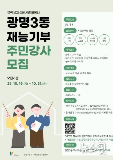 박승원 광명시장은 “이번 주민 강사 모집으로 경력이 단절된 여성과 재취업을 희망하는 신중년 등에게 새로운 기회를 제공하고, 지역 공동체 활성화를 이끌겠다”며 “앞으로도 다양한 주민 참여 프로그램으로 지역에 활력을 더하겠다”고 밝혔다.