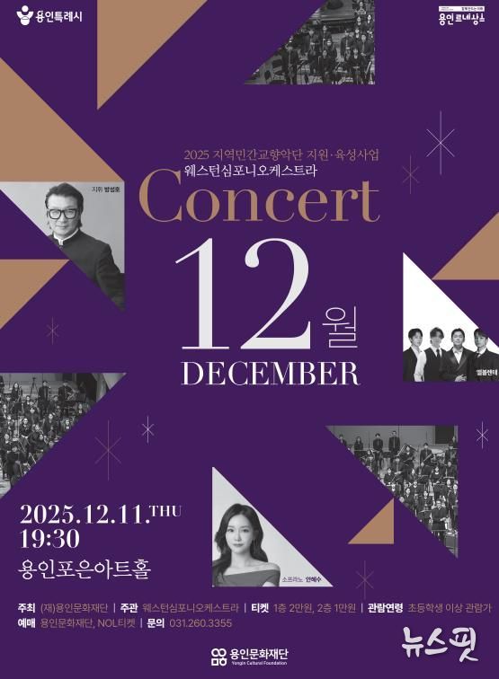 (뉴스핏 = 김수진 기자) 용인문화재단은 오는 12월 11일 오후 7시 30분, 용인포은아트홀에서 웨스턴심포니오케스트라 '콘서트 ‘12월’' 공연을 개최한다고 23일 밝혔다.