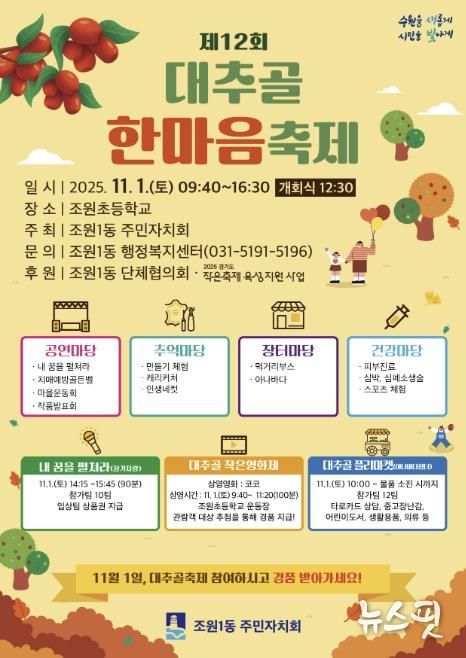 (뉴스핏 = 김수진 기자) 수원시 장안구 조원1동 주민자치회와 조원1동 단체협의회는 오는 11월 1일, 지역 주민이 함께 어울리는 ‘제12회 대추골 한마음 축제’를 개최한다.
