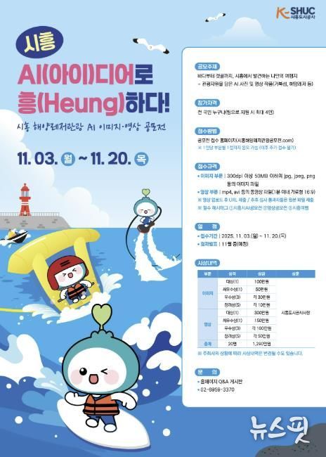 이번 공모전은 ‘바다부터 갯골까지, 시흥에서 발견한 나만의 여행’을 주제로 진행된다. 거북섬, 해양레저 등 시흥의 관광자원을 담은 AI 이미지 및 영상 작품을 공모하며, 시흥시에 관심 있는 국민 누구나 개인 또는 4인 이내의 팀으로 참여할 수 있다.