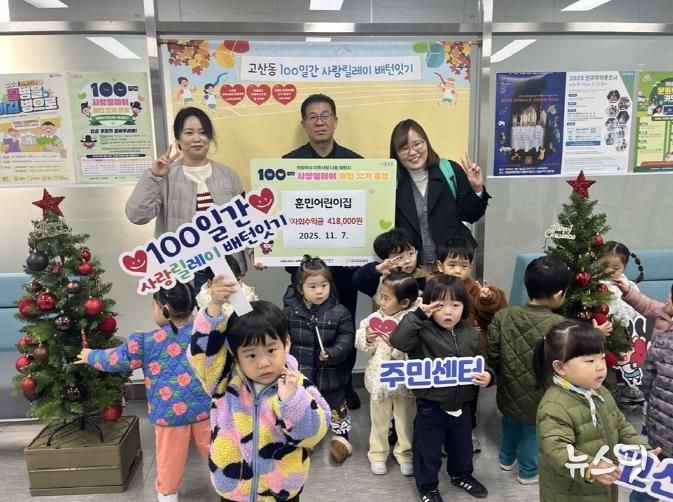 (뉴스핏 = 김호 기자) 의정부시 고산동주민센터는 11월 7일 훈민어린이집이 바자회를 통해 모은 수익금 40여만 원을 기탁하며 ‘100일간 사랑릴레이 배턴 잇기’에 동참했다고 밝혔다.