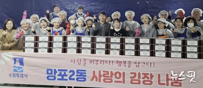 (뉴스핏 = 김호 기자) 수원시 영통구 망포2동은 지난 13일 망포2동 행정복지센터에서 2025 이웃사랑 김장 나눔 행사를 진행했다. 망포2동 새마을문고가 주관하고 망포2동 단체협의회가 후원하여 진행한 김장 나눔 행사에서 10여 명의 인원이 모여 김장 김치를 담갔다.