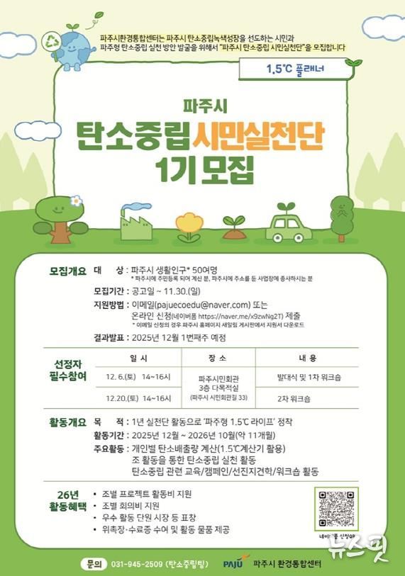 (뉴스핏 = 김호 기자) 파주시환경통합센터는 시민들의 탄소중립 실천을 확산하고 생활 속 저탄소 문화를 정착시키기 위해 ‘탄소중립 시민실천단 1기(1.5도시(℃) 플래너)’를 모집한다고 밝혔다.