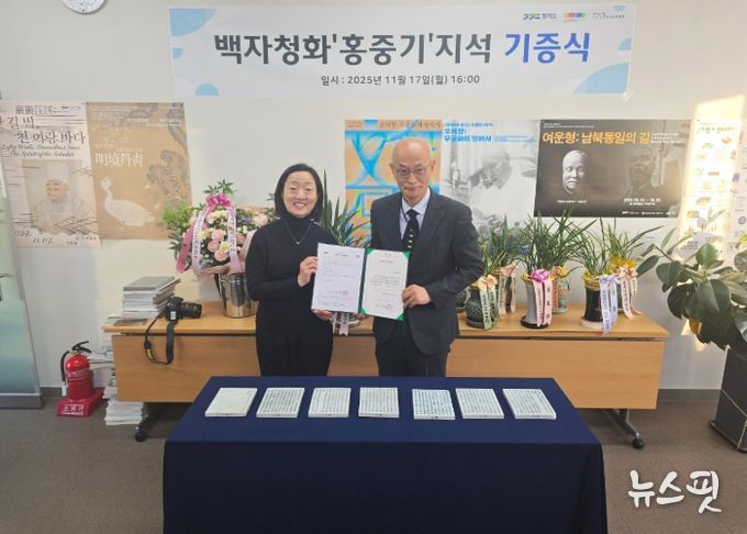 (뉴스핏 = 김수진 기자) 경기문화재단 경기도박물관은 2025년 11월 17일 조선시대 ‘홍중기백자지석’의 기증식을 개최했다. 기증식에는 유물을 기증한 재일교포 이수혜님과 홍중기의 본관인 풍상홍씨 대종회 홍광식 회장, 풍상홍씨 추만공파 종중 홍경희 회장 등이 참석하여 자리를 빛냈다.