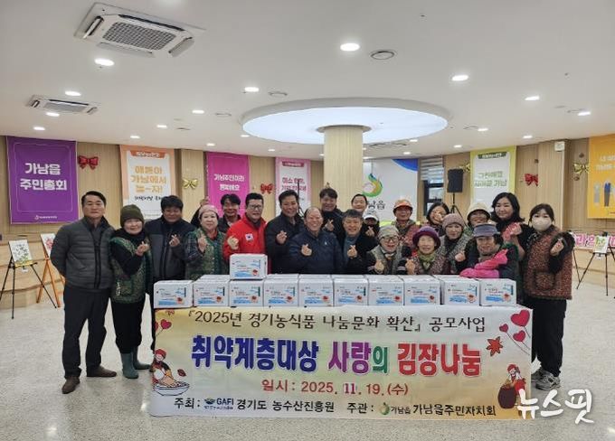 (뉴스핏 = 김호 기자) 가남읍주민자치회는 11월 18일에서 19일 이틀간 가남읍 행복나눔센터 1층에서 ‘취약계층대상 사랑의 김장나눔’봉사를 개최했다. 이번 행사는 '2025년 경기농식품 나눔문화 확산' 공모사업의 일환으로 진행됐으며, 정성스럽게 담근 김장김치와 알타리김치를 관내 40개 마을의 홀몸어르신 80명에게 전달했다.