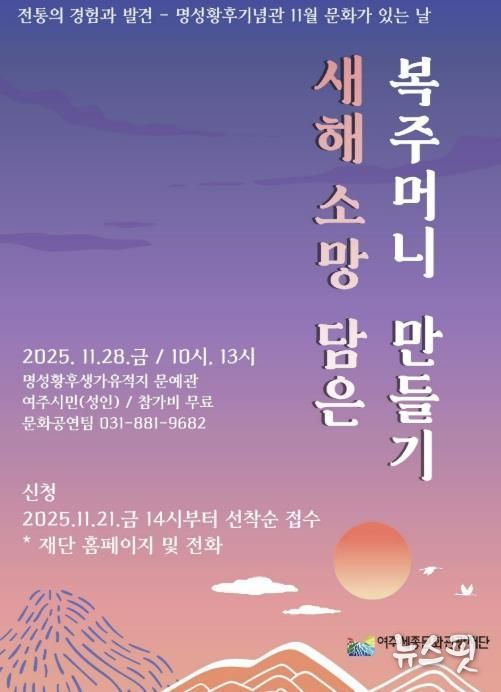 (뉴스핏 = 김호 기자) 여주세종문화관광재단은 오는 28일 명성황후기념관 11월 문화가 있는 날 프로그램으로‘새해 소망 담은 복주머니 만들기’를 진행한다고 26일 밝혔다.