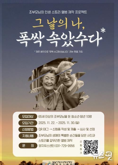 (뉴스핏 = 김호 기자) 성남시청소년청년재단 양지유스센터에서 지역 어르신의 삶을 기록하고 세대 간 공감을 확산하기 위한 생애앨범 제작 프로젝트 '그 날의 나, 폭싹 속았수다'를 진행한다고 26일 밝혔다.