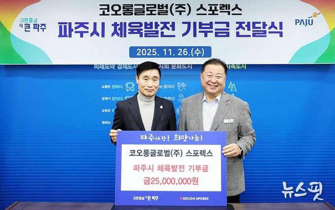 (뉴스핏 = 김호 기자) 파주시는 코오롱글로벌㈜이 지난 26일 파주시 체육 발전을 위한 기부금 2천5백만 원을 전달했다고 밝혔다.