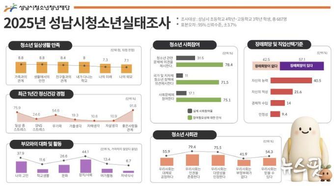(뉴스핏 = 김호 기자) 성남시청소년청년재단은 관내 초등학교 4학년부터 고등학교 3학년까지의 총 687명을 대상으로 실시한‘2025년 성남시청소년실태조사’결과를 발표했다. 이번 조사는 성남시 청소년의 생활․정서․관계․사회참여 전반의 실태를 종합적으로 파악하기 위한 것으로, 표본오차는 ±3.7%이다.