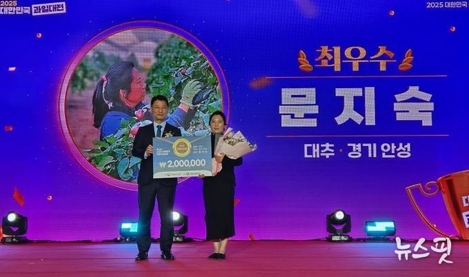 (뉴스핏 = 김수진 기자) 농림축산식품부 주최, 한국과수농협연합회 주관으로 하는 ‘2025 대한민국 과일산업대전 대표과일선발대회’에서 안성시가 2023년부터 대추부문에서 최우수상, 우수상을 수상하여 3년 연속 대추부문 최고자리에 올랐다. 수상자로 문지숙 대표가 최우수상(농림축산식품부장관상)으로 선정됐고, 조재곤 대표가 우수상(산림청장상)으로 선정됐다.